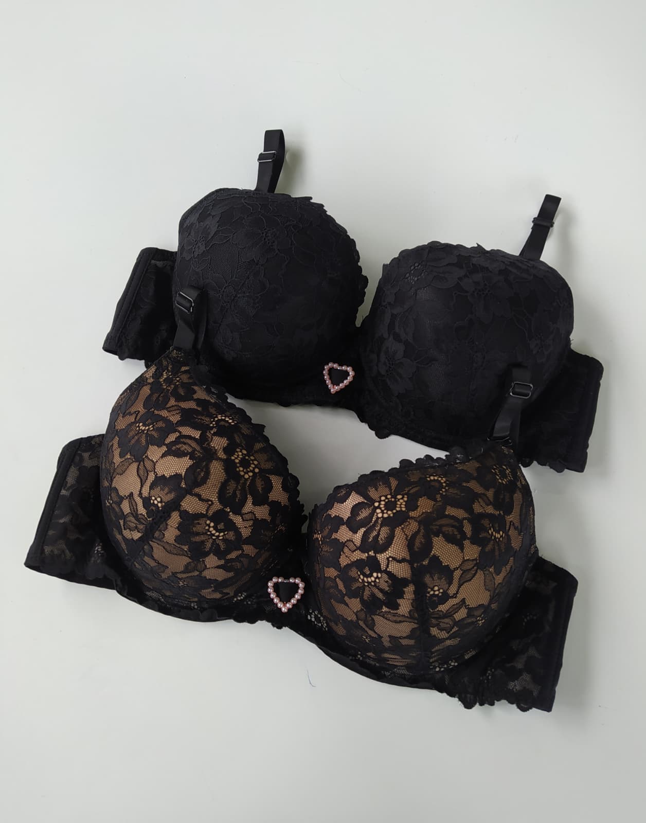 • ozdobne serduszko z perełek między miseczkami – elegancki detal