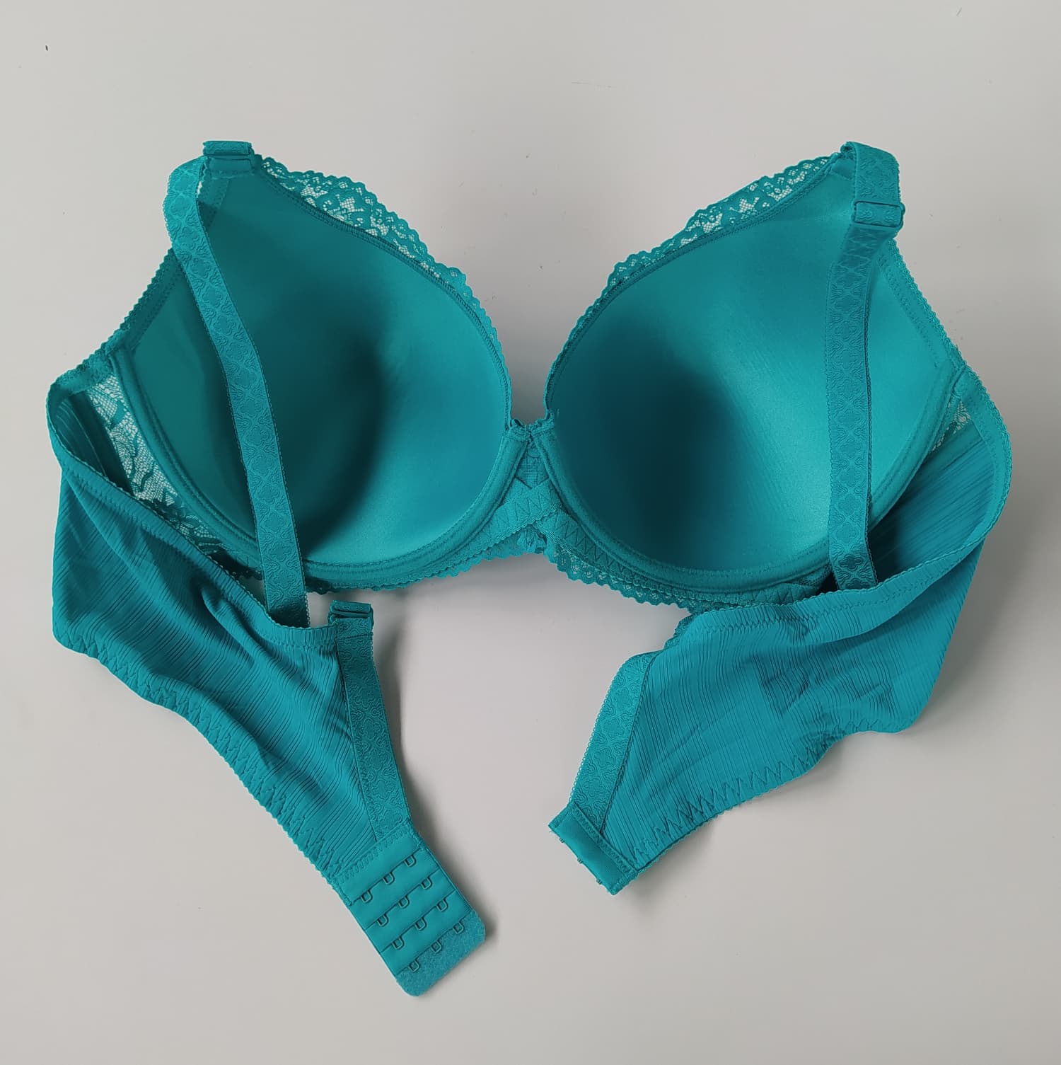 Model łączy w sobie ozdobną siateczkę oraz delikatną koronkę, tworząc zmysłowy i stylowy efekt. Pół miseczki o prążkowanej strukturze dodają nowoczesnego charakteru i wyróżniają model na tle klasycznej bielizny. Odpinane i regulowane ramiączka pozwalają dopasować biustonosz do różnych stylizacji, a stabilne zapięcie na 3 haftki gwarantuje wygodę i dobre dopasowanie.