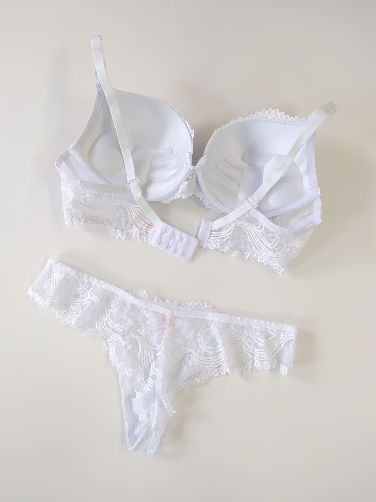 Komplet bielizny push-up – miseczka B, „ręka Adama”, koronka i transparentne stringi