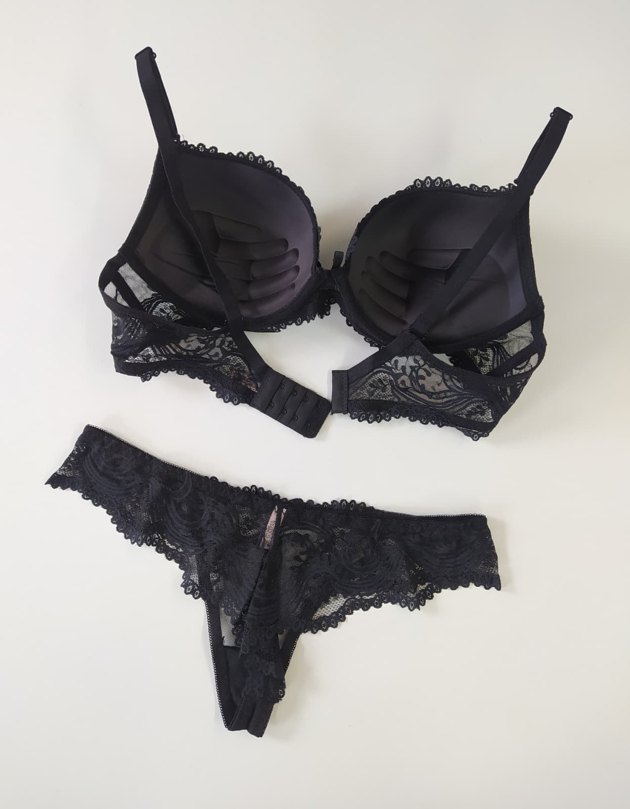 Komplet bielizny push-up – miseczka B, „ręka Adama”, koronka i transparentne stringi
