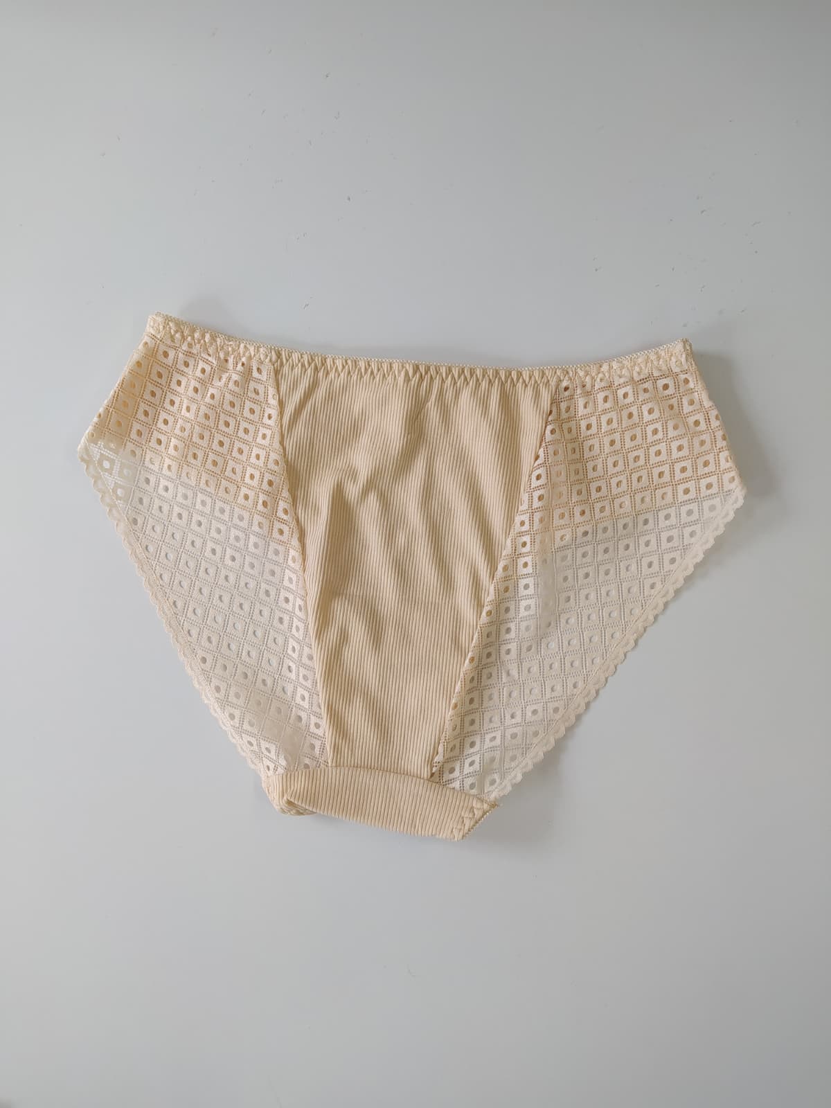 Prążkowany materiał w połączeniu ze wzorem w romby nadaje bieliźnie nowoczesnego i stylowego charakteru. Koronkowe wykończenie dodaje elegancji i subtelnej kobiecości, tworząc harmonijne połączenie wygody i estetyki.