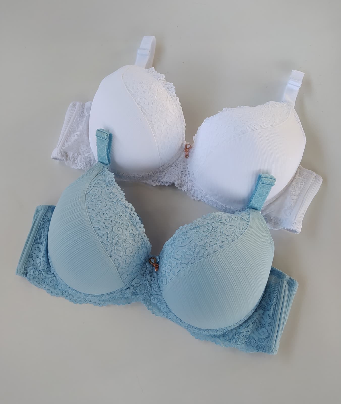 Prążkowane miseczki nadają bieliźnie nowoczesnego, lekko strukturalnego wyglądu, który wyróżnia model na tle klasycznych fasonów. Koronkowe obszycie dodaje subtelnej elegancji i kobiecego charakteru.